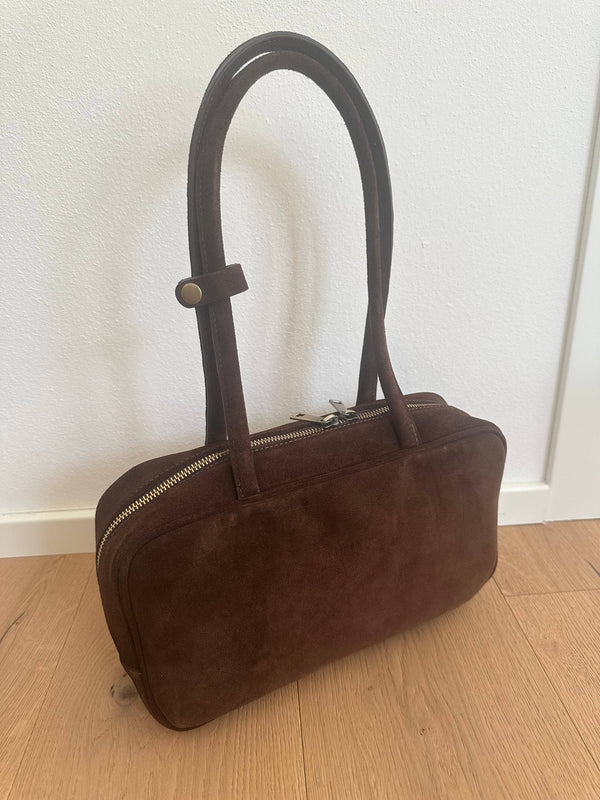 Sac en véritable cuir suédé de très haute qualité avec finitions en bronze ancien. Fait main, fabriqué en Italie. Double poignée à porter à l'épaule. Pieds protecteurs sous le sac et fermeture à glissière. Intérieur doublé en tissu avec poche. Le sac a une forme rectangulaire, épurée et simple, parfaite pour être personnalisé avec des charms ou des 🧣foulards. Adapté pour un usage quotidien, comme pour le travail ou l'université, très confortable, léger et tendance. • quincaillerie : bronze ancien 📏DIMENSIONS : Hauteur 20cm Longueur 30cm Épaisseur 8cm hauteur des doubles poignées 26cm ‼️ Sac entièrement fait main qui peut présenter de petites imperfections naturelles dans les articles artisanaux.