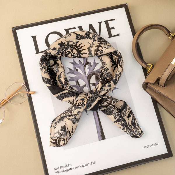 Ce foulard carré 70x70 arbore un motif céleste vintage mêlant soleils et lunes dans un style géométrique raffiné. Ses tons noir et blanc offrent une allure intemporelle et mystique. Parfait pour sublimer vos tenues avec une touche d’élégance cosmique et un charme rétro assumé